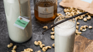 Cashewpähkinät sopivat täydellisesti myös kotitekoiseen cashewmaitoon. Siivilöintiä ei tarvita: sekoita 1 osa cashew’ta ja 5 osaa vettä 30–40 sekunnin ajan. Mausta ripauksella suolaa ja halutessasi hunajalla tai vaniljalla. Säilyy jääkaapissa 3–4 päivää.